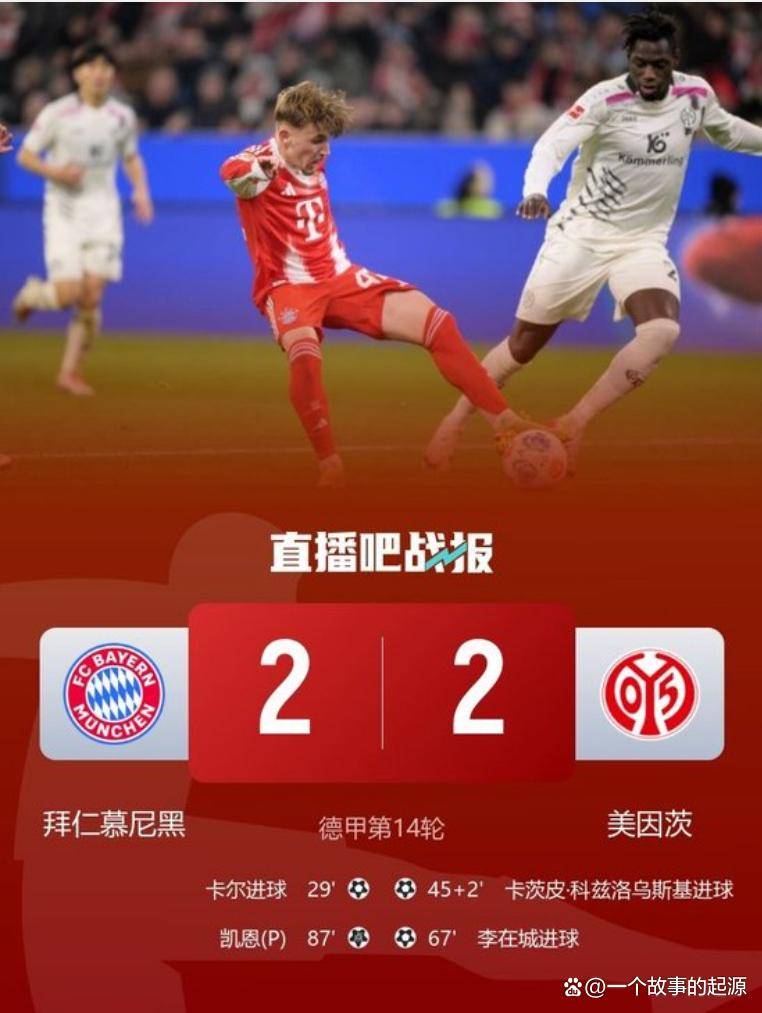 然而美因茨展现了顽强斗志。上半场补时阶段,卡珀尔·波图尔斯基头球扳平比分;第67分钟,李在成精彩头球反超比分。拜仁直到第87分钟才凭借凯恩的点球勉强扳平。