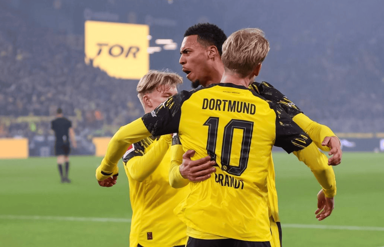 比赛只踢了10分钟,多特蒙德就进球了!聚勒在右侧起球传中,皮球飞到后点。布兰特凌空射门,皮球弹地后钻入球门!多特蒙德获得梦幻般的开局。第30分钟,阿德耶米有扩大比分的机会,只可惜他的近距离射门被门将扑了出去。第42分钟,雷纳在禁区外起脚远射,皮球被挡了一下发生折射,偏出了球门。半场结束,多特蒙德1-0领先门兴格拉德巴赫。